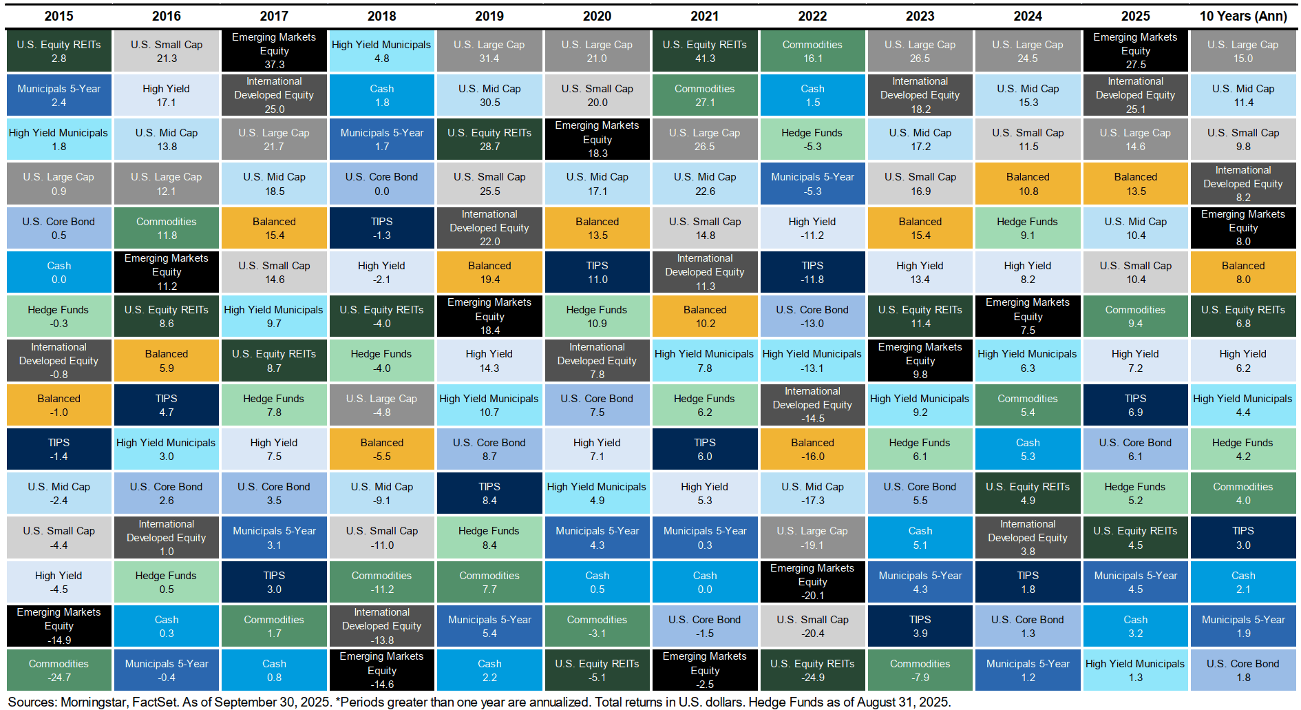 Below, note how the leaders and laggards change each year. No single asset class consistently outperforms – diversification matters.